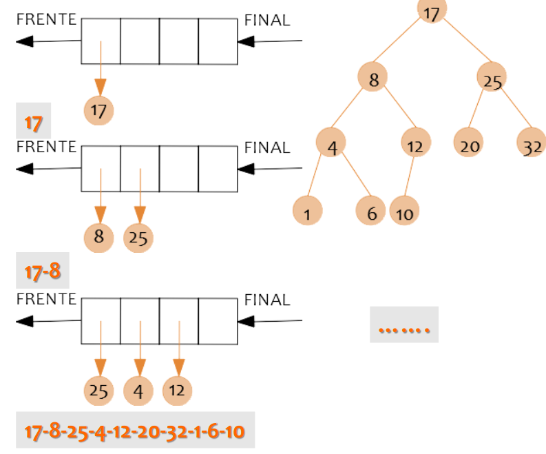 En cada nodo, en función del recorrido seleccionado, se imprime el elemento actual o se sigue descendiendo por el subárbol hasta llegar a un nodo hoja y empieza a subir hasta los demás.