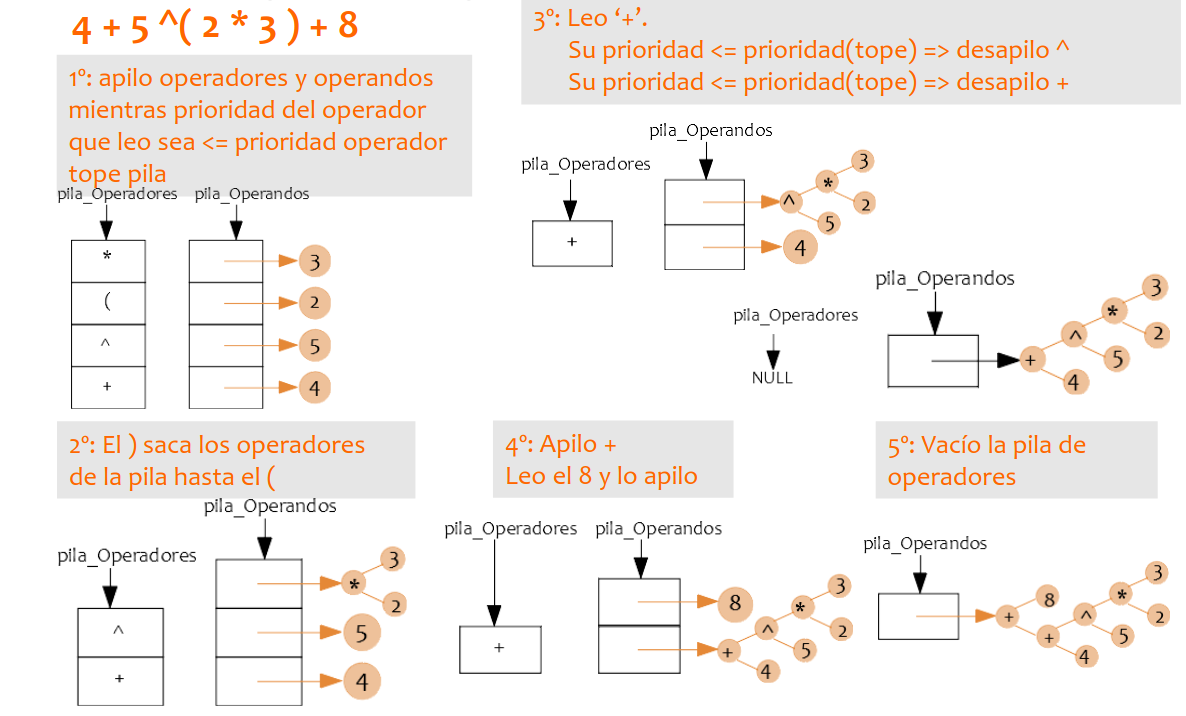 - Usamos 2 pilas, una de operadores y otra de operandos . Se van apilando hasta llegar a un operador cuya prioridad es menor o igual que la del tope de la pila. Esto provoca que se desapile en dicha pila y se vaya formando la expresión en la pila de operandos con los operadores desapilados.