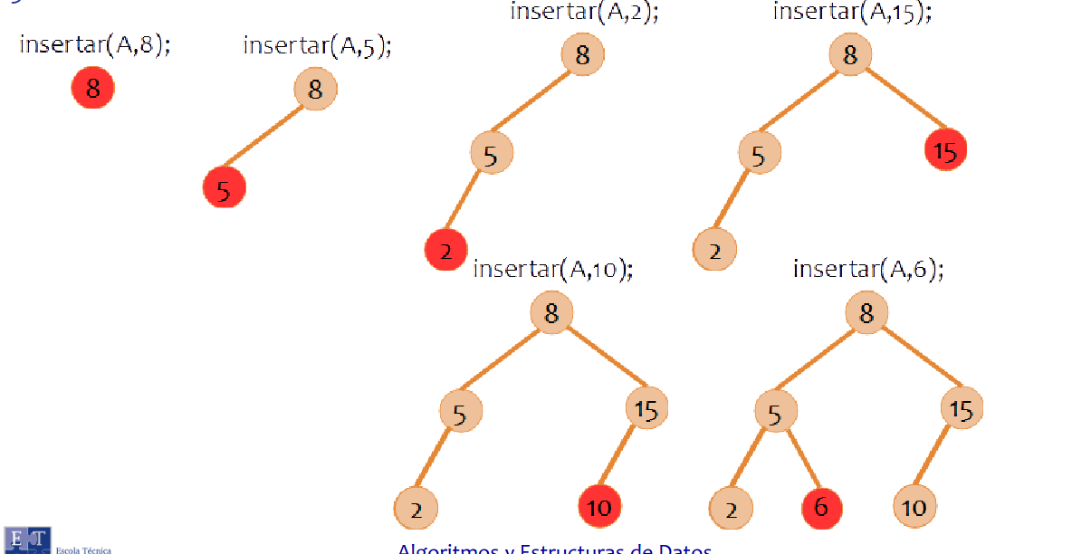 Sección titulada «Inserción»En un ABB la inserción no se puede realizar en el primer hueco libre que se vea, sino que hay que respetar la estructura, buscando desde la raíz el hueco correspondiente al nodo que queremos insertar. Por lo tanto, la inserción es recursiva, ya que se parte del nodo raíz y se va mirando si el elemento que queremos insertar es menor o mayor, bajando por la rama correspondiente hasta encontrar su sitio. Como clara desventaja de este tipo de árbol, tenemos el caso en el que la mayor parte de los elementos que se inserten sea mayores o menores que el nodo raíz, provocando un árbol desbalanceado, lo que además aumenta el tiempo de búsqueda, al tener que recorrer muchos elementos, como si se tratase de una lista.