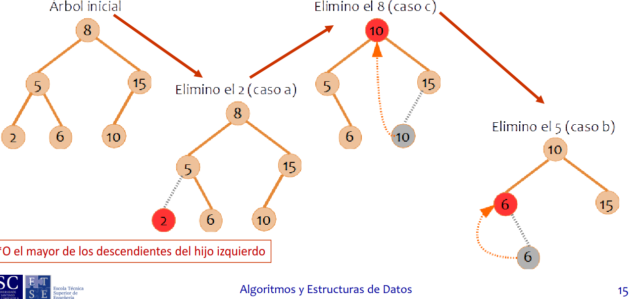 Sección titulada «Eliminar nodos árbol binario»Hay 3 casos Si es un nodo hoja se elimina directamente Si el nodo tiene un único hijo se intercambian y se elimina Si el nodo tiene dos hijos, se intercambia con el mayor izquierdo o el mayor derecho