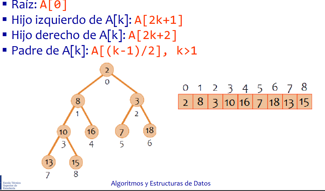 Sección titulada «Estática»Se representa los elementos del árbol dentro de un array., usando el índice de cada elemento como localizador (puntero) de su padre o de sus hijos. De esta forma, el hijo izquierdo de k se sitúa en la posición 2k y el hijo derecho en la posición 2k+1 , mientras que su padre entra en la posición k/2.