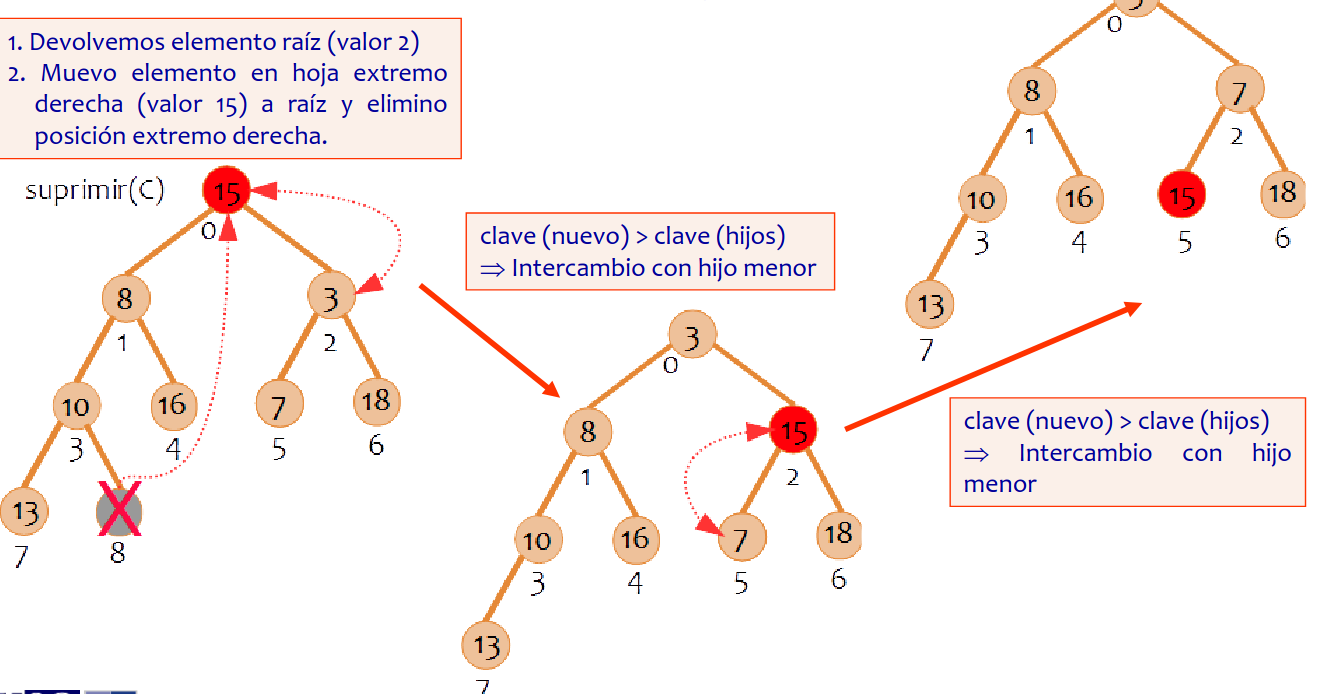 Sección titulada «Eliminación»En este tipo de árboles, el elemento que se quiere suprimir es siempre el de mayor prioridad, es decir, la raíz. Para llevar a cabo esta operación, el nodo raíz se intercambia de posición con el nodo hoja más a la derecha, y una vez allí se elimina. A continuación se procese a la reorganización del nuevo nodo raíz hasta encontrar su sitio, intercambiándolo con el hijo menor en cada caso.