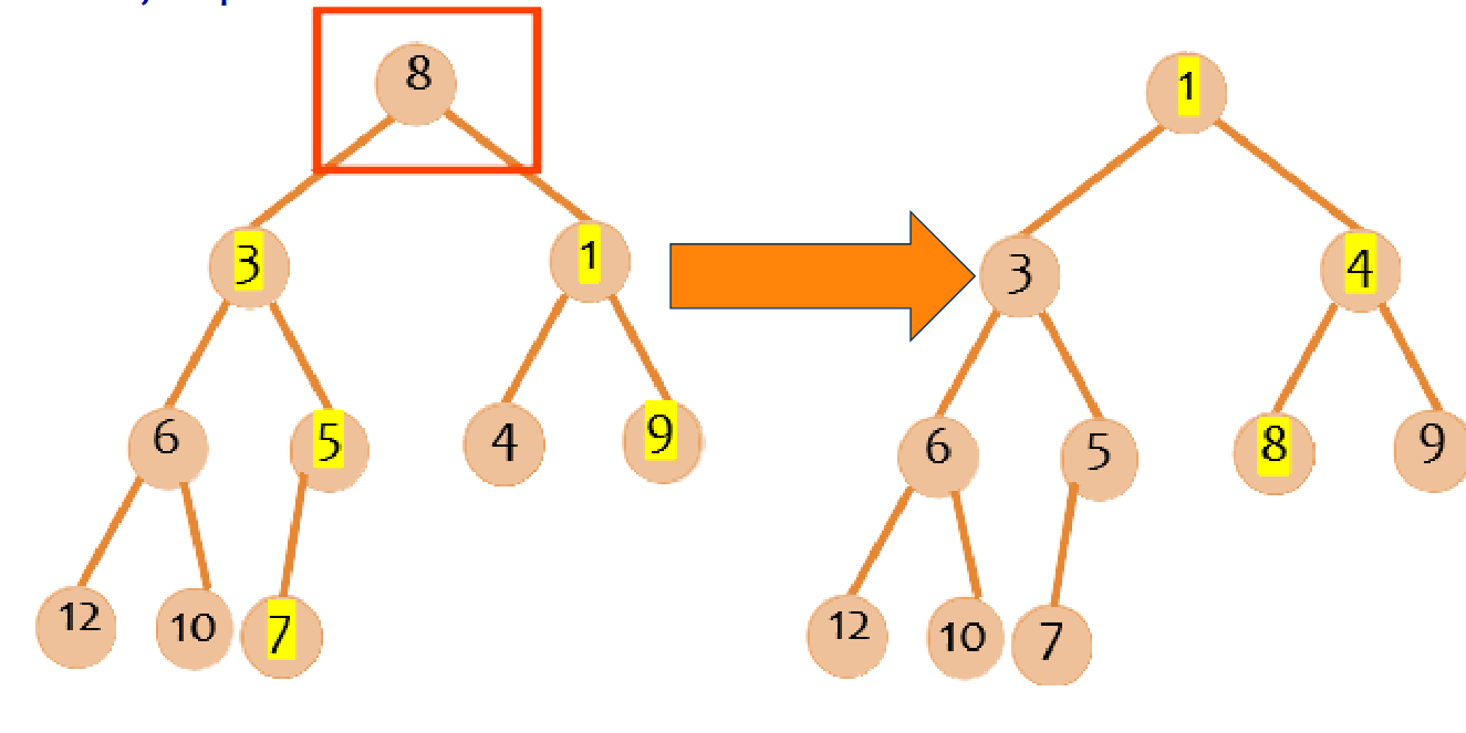 Para eliminar si lo pide cambiamos la raíz con el ultimo nodo, eliminamos y recolocamos.