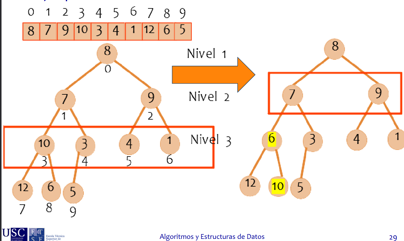 Para eliminar si lo pide cambiamos la raíz con el ultimo nodo, eliminamos y recolocamos.