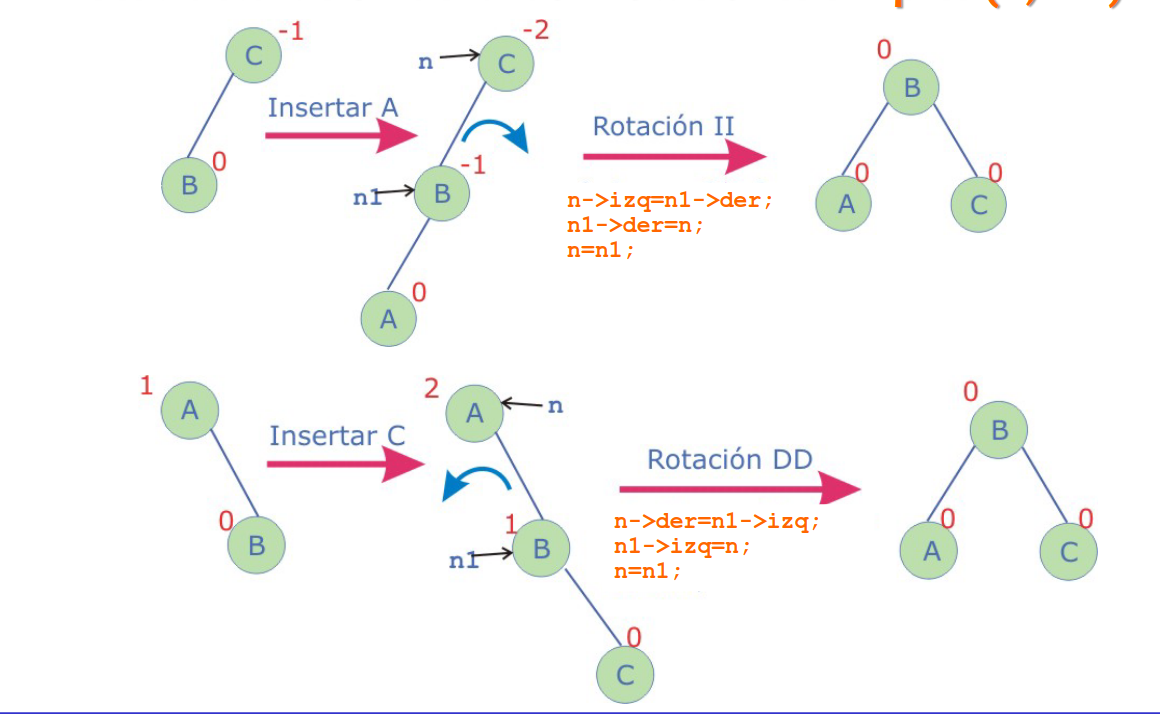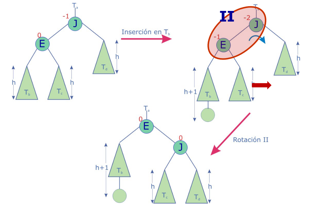 Rotación simple II: Se produce cuando un nodo tiene factor -2 y su hijo izquierdo factor -1. Se rota hacia la derecha, dejando el nodo con factor -1 como nuevo padre, el nodo con factor -2 como hijo derecho, y el nodo que origino el desequilibrio como hijo izquierdo.