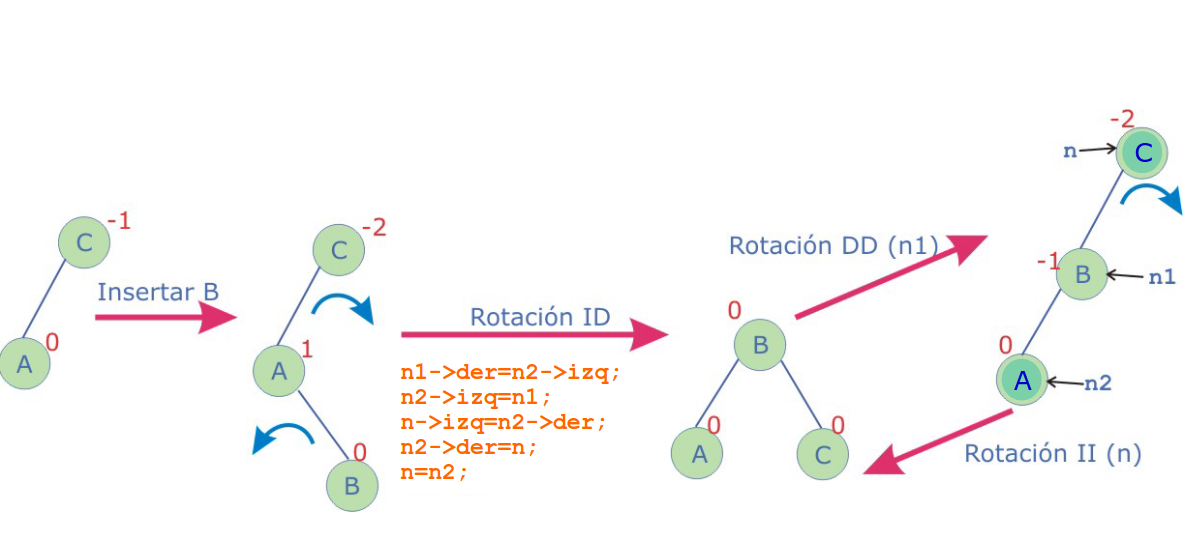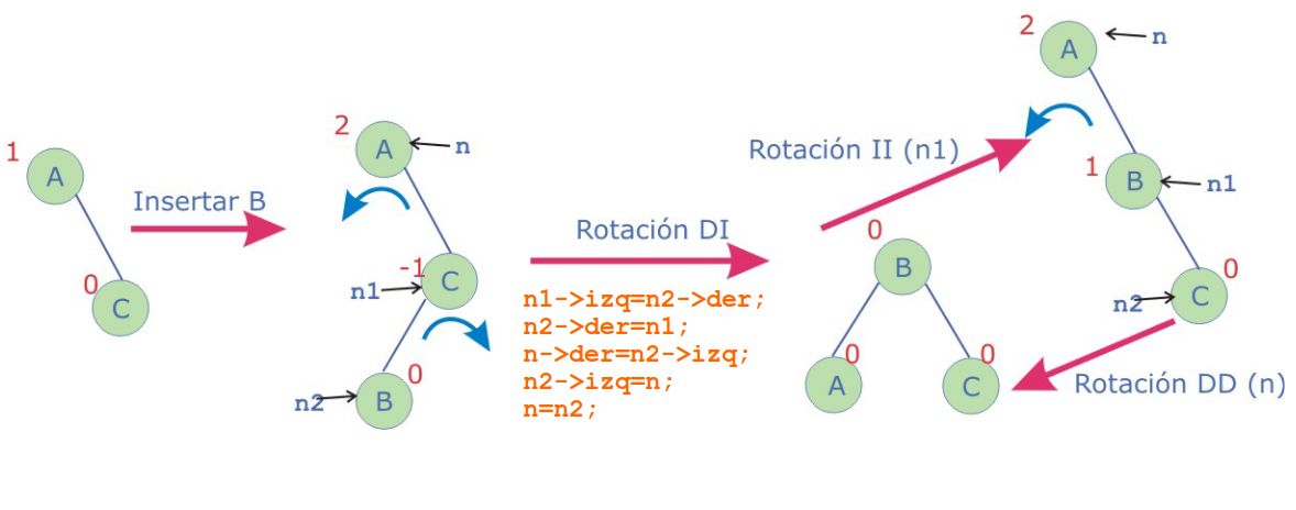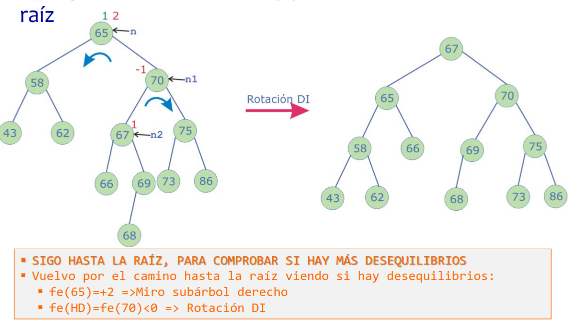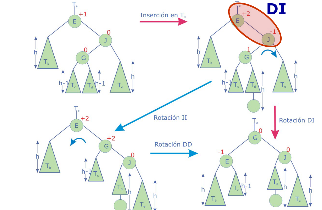 Rotación compuesta DI: se produce cuando un nodo tiene factor 2 y su hijo derecho, factor -1. Se rota el hijo con factor a la derecha y se sube el nodo que originó el desequilibrio a su posición, y se tiene una rotación simple DD.