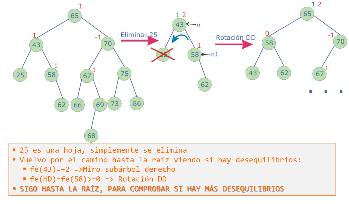 - Si tiene 2 subárboles, se busca el nodo más a la derecha del subárbol derecho, o el nodo más a la izquierda del subárbol derecho, se sustituye, se elimina y se comprueba si hace falta reestructurar.