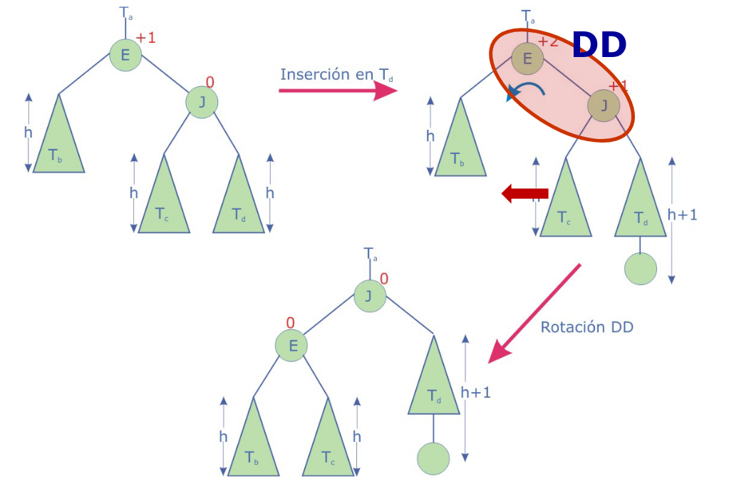 Rotación simple DD: Se produce cuando un nodo tiene factor 2 y su hijo derecho es factor -1. Es lo contrario al caso anterior: Rotación a la izquierda, nodo con factor 1 como padre, nodo con factor 2 como hijo izquierdo, y nodo que originó el desequilibrio como hijo derecho.