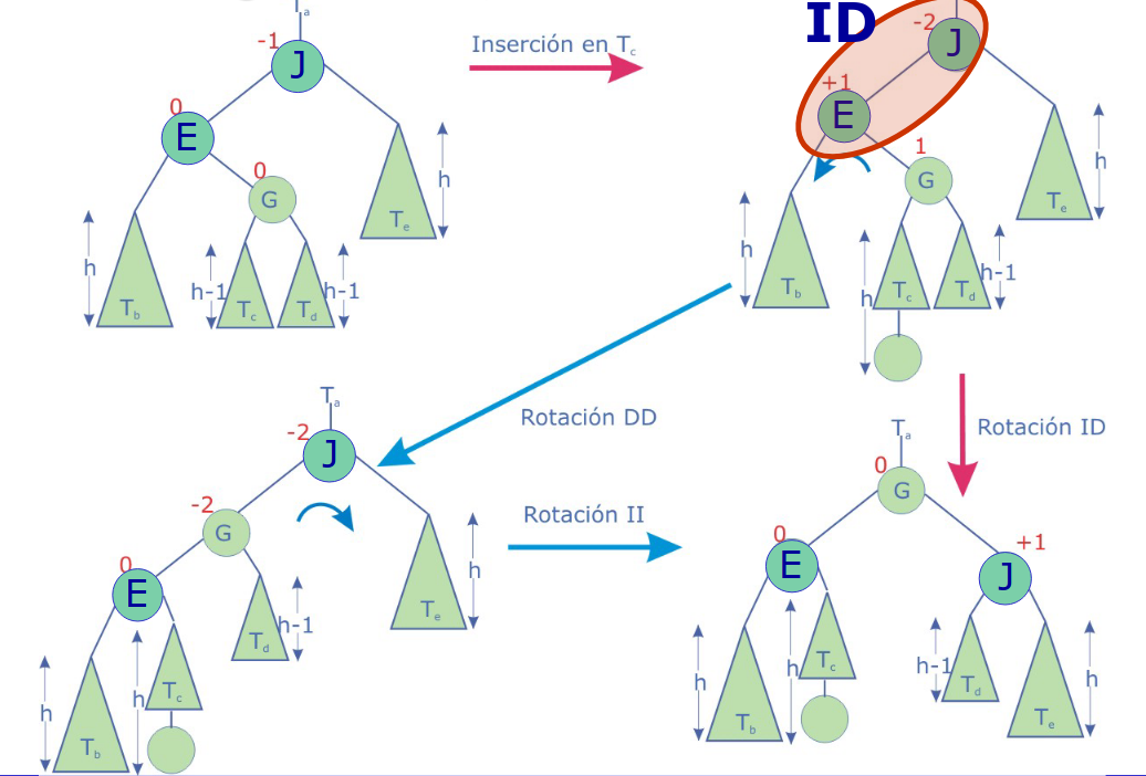 Rotación compuesta ID: se produce cuando un nodo tiene factor -2 y su hijo izquierdo, factor 1. Se rota el hijo con factor 1 a la izquierda y se pone el nodo que causó el desequilibrio en su posición, teniendo una rotación simple II