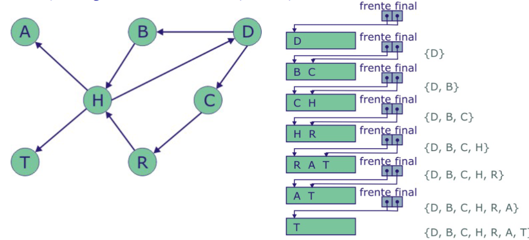 - Utiliza una cola para almacenar los nodos a visitar.