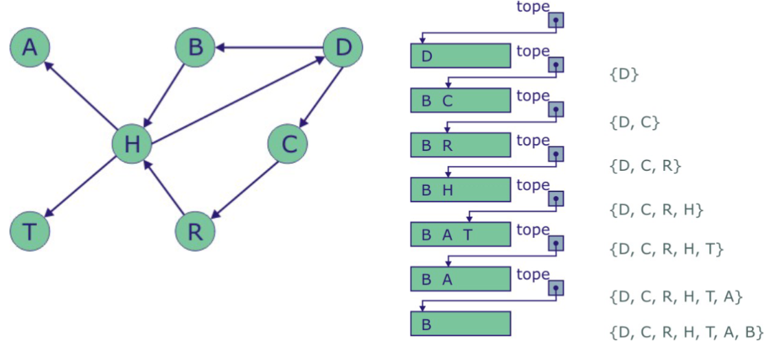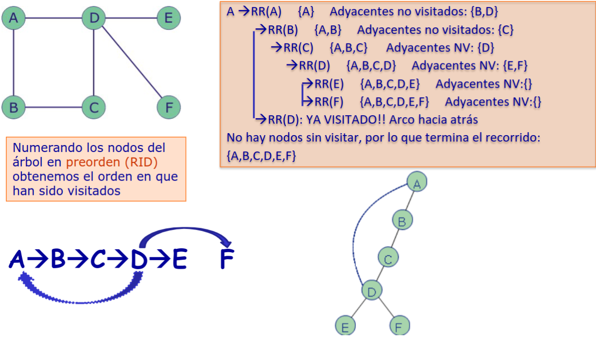 - Puede implementarse de manera recursiva o utilizando una pila como estructura auxiliar.