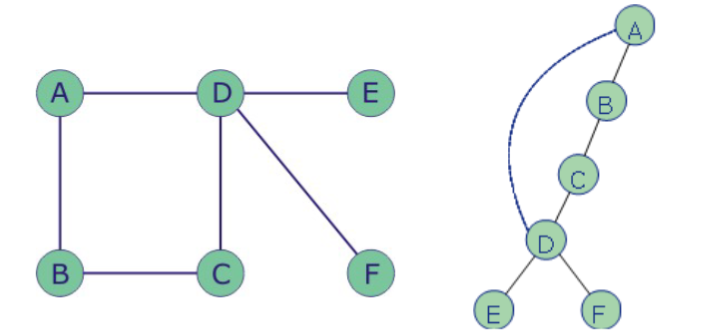 Sección titulada «Recorrido en profundidad (DFS - Depth-First Search)»- A partir de un nodo, se recorre cada vértice adyacente hasta no encontrar más nodos no visitados.