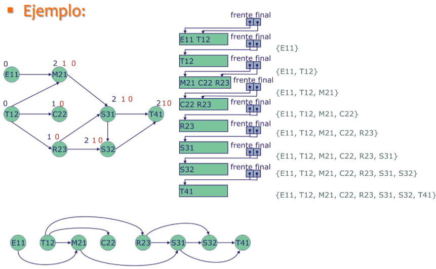 - Se buscan los nodos con grado entrante cero y se colocan en una cola.