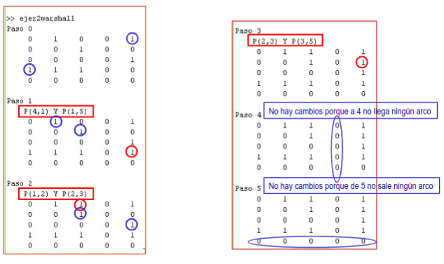 Por tanto, la matriz , siendo el número de nodos, nos mostrará los caminos más cortos entre cualquier par de vértices, independientemente de la longitud del camino.