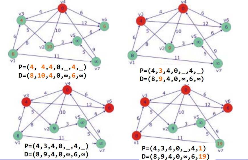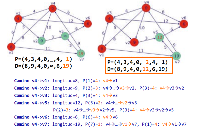 Se repiten estos pasos sobreescribiendo solo el valor de aquellos caminos que tuvieran una longitud mayor a la obtenida por medio del vértice de estudio actual. Como se ve, tiene la desventaja de que si queremos saber el camino mínimo entre cualquier par de vértices, tenemos que realizar el algoritmo partiendo de todos los vértices del grafo y luego comparar.