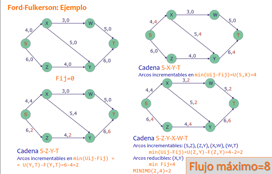 Para resolver estos problemas de maximización de flujo, se emplea el Algoritmo de Ford-Fulkerson, que busca caminos entre el nodo fuente y el sumidero en los que se pueda incrementar el flujo todavía más, para obtener en el sumidero la mayor cantidad de elementos posibles.