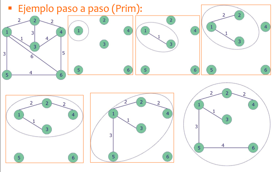 Sección titulada «6.6.1 Algoritmo de Prim»Es un algoritmo voraz, ya que en cada paso se añade el arco más corto disponible al árbol (mejor solución en cada paso). Se parte de un vértice inicial y se añade el vértice adyacente cuyo arco entre ambos tenga el menor peso. A continuación, entre los vértices ya conectados, se busca el arco de menor peso que conecte sus vértices adyacentes que no hayan sido conectados todavía. Estos pasos se repiten hasta haber conectado todos los vértices.