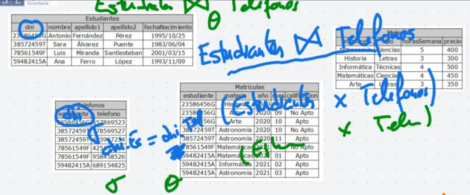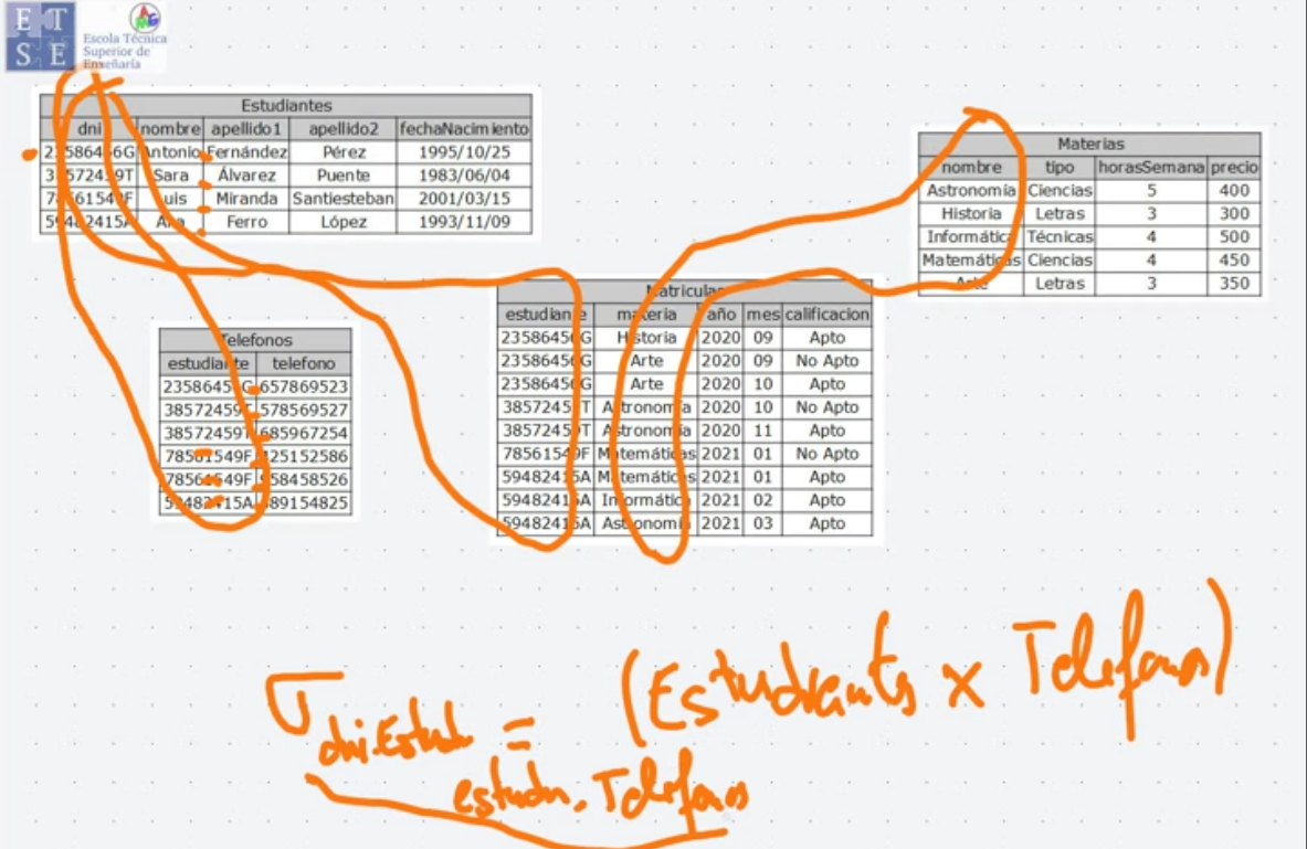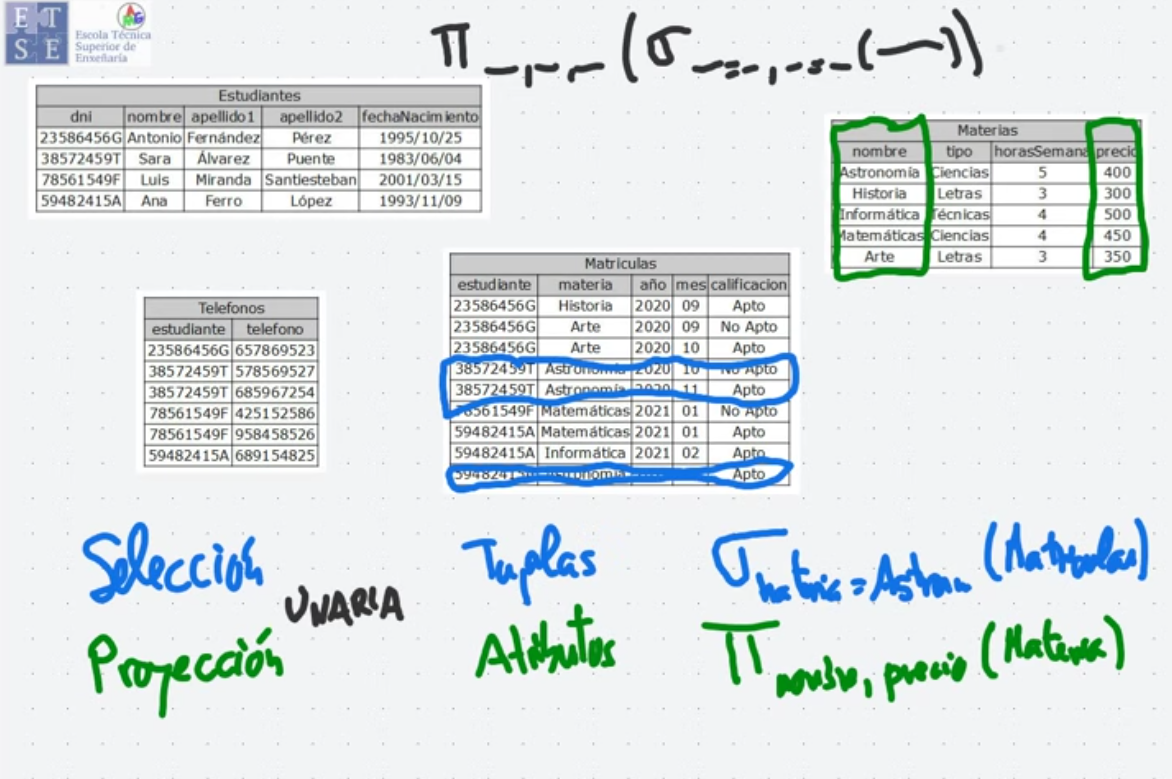 Sección titulada «4.2 Álgebra Relacional»El álgebra relacional es un lenguaje de consulta procedimental que permite operar sobre relaciones (tablas) en bases de datos relacionales. Define un conjunto de operaciones que, operando sobre tablas, devuelve tablas.