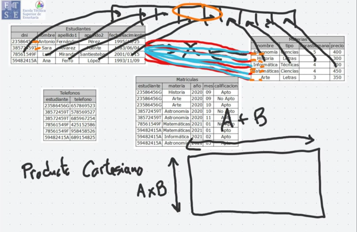 Ejemplo: Supongamos que queremos obtener el producto cartesiano de Profesor y Enseña y luego hacer una selección sobre el resultado.