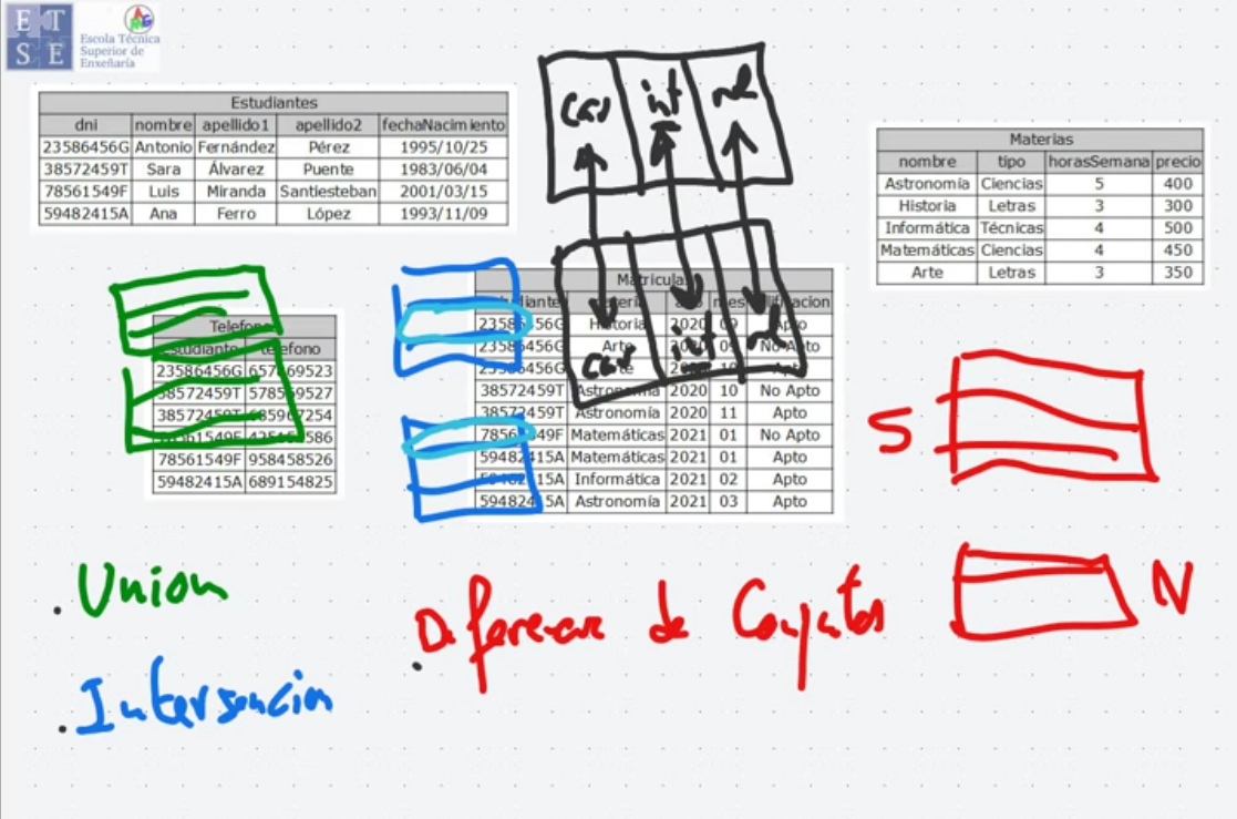 Las operaciones pueden ser unarias (operan sobre una única tabla) o binarias (operan sobre 2 tablas).