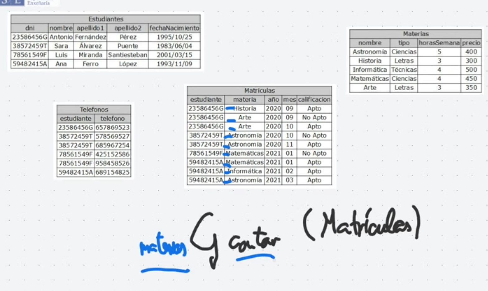 sum,avg,count,min, ymaxpara resumir datos en una relación. También permite agrupar los datos por ciertos atributos antes de aplicar la función de agregación, como calcular el promedio por departamento.