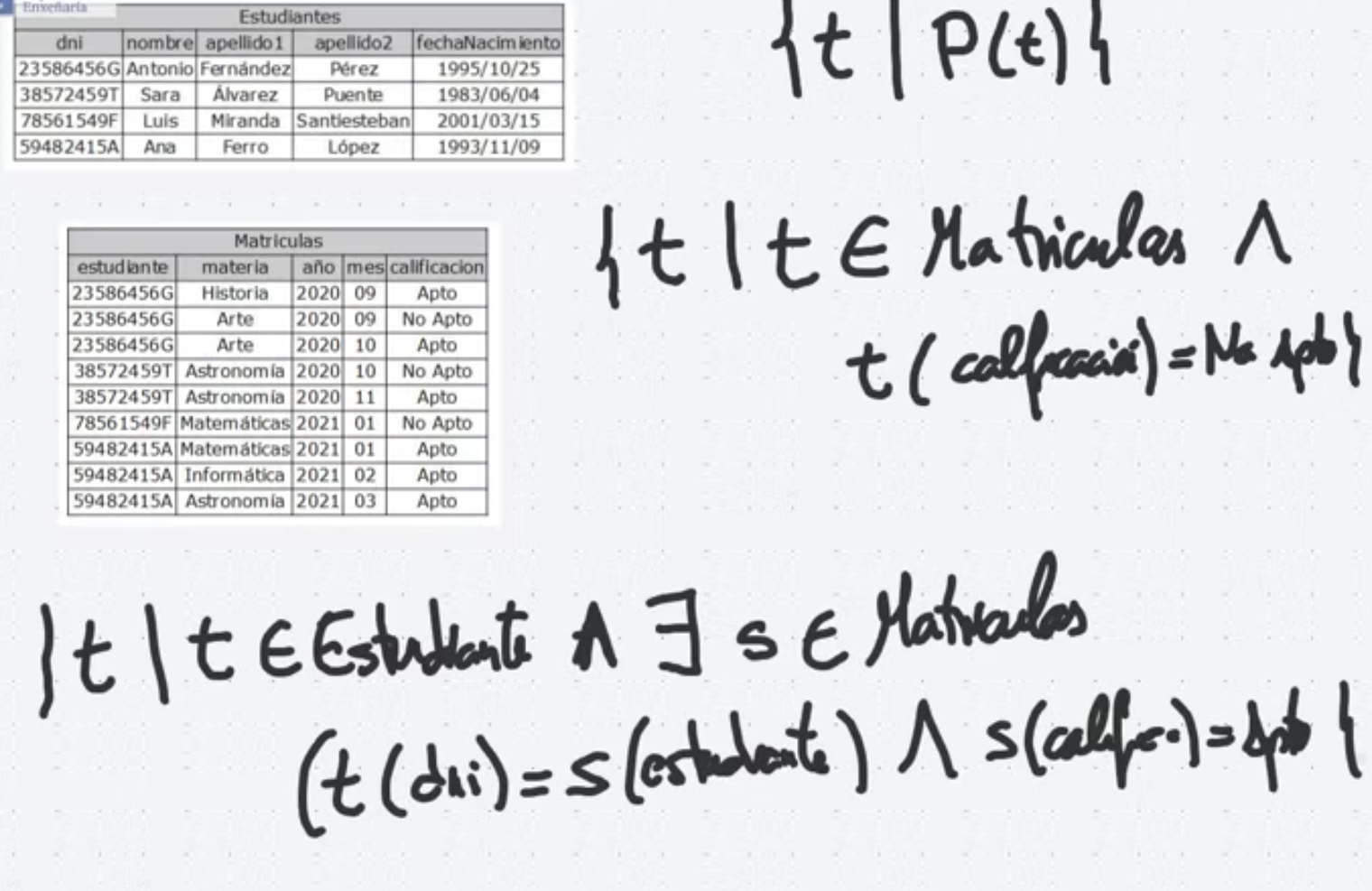 Sección titulada «4.5 Cálculo Relacional de Tuplas»El cálculo relacional de tuplas es un lenguaje de consultas no procedimental** que describe la información deseada sin especificar un procedimiento concreto para obtenerla. Las consultas se expresan como: