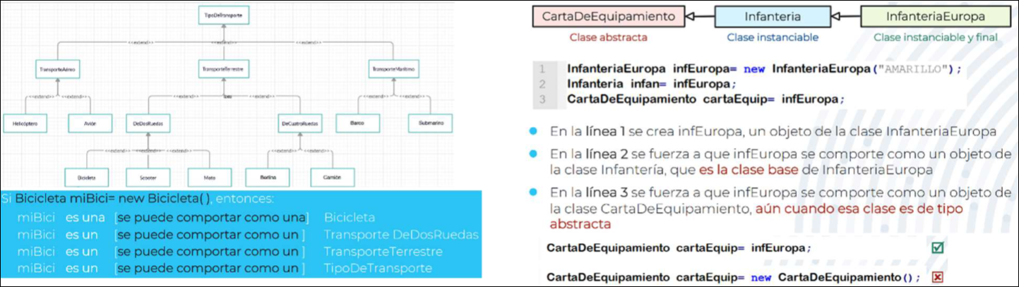 Sección titulada «5.1 Polimorfismo en herencia»El polimorfismo en herencia es el mecanismo por el cual un objeto se puede comportar de múltiples formas en cada momento, en función del contexto en el que aparece en el programa. Un objeto se puede comportar como una instancia de: