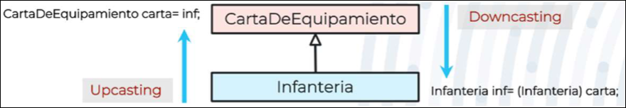 Sección titulada «5.2 Upcasting y Downcasting»Cuando se hace que un objeto se comporte como una clase distinta a la que pertenece, está forzando un casting, un cambio de tipo de dato en él. El casting no implica una nueva reserva de memoria: el objeto sigue siendo el mismo, independientemente de los castings que se hagan sobre él. El casting afecta a la visibilidad de los atributos y métodos que se pueden invocar desde el objeto.