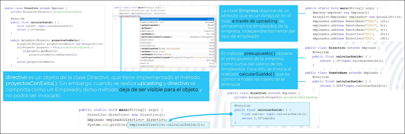[!Nota] Si un método está sobrescrito cuando se realiza upcasting, el objeto usará la implementación del método correspondiente a la clase a la que pertenece el objeto, de modo que aunque se comporta como otra clase, no utiliza las implementaciones de los métodos de esa otra clase