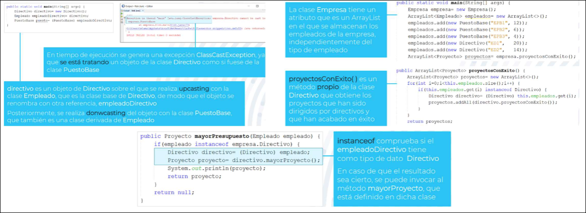 - En tiempo de ejecución tiene lugar el casteo, pero sólo se comprueba si el objeto pertenece a la clase derivada a la que se castea. Aunque la clase a la que pertence el objeto soporte los mismos métodos y atributos que la clase derivada, si no lo es, se generará la excepción.