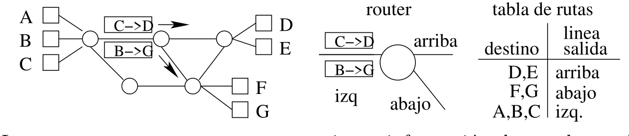 Cada paquete tiene en su cabecera la dirección IP de destino. Cuando llega a un router, este leer la dirección y decir por qué camino enviarlo, colocándolo en en la cola de salida más adecuada. Esto se conoce como encaminamiento y se usa una tabla de rutas para decidir a qué cola se debe enviar el paquete. Estas tablas se actualizan continuamente para reflejar los cambios en la red. Los routers además no almacenan ninguna información sobre los paquetes anteriores, por lo que paquetes de la misma transmisión pueden seguir rutas diferentes y podrían llegar al destino desordenados.