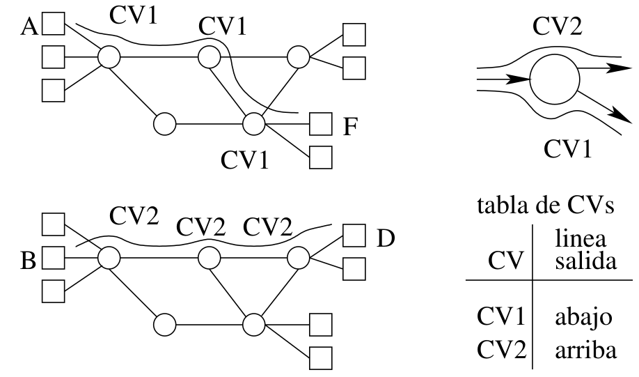 Sección titulada «1.4.5 Redes de Circuitos Virtuales»En las redes de circuitos virtuales, se establece una conexión lógica entre el emisor y el receptor antes de que los paquetes se transmitan. Esta conexión no es física, sino una ruta planificada que se sigue durante la transmisión.