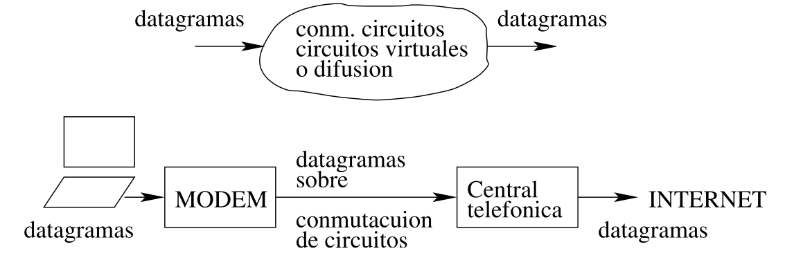 Sección titulada «1.5 Redes de difusión»Todos los host reciben las transmisiones pero solo la procesa el destinatario. La wifi es un ejemplo. Internet es una red de datagramas, así los especifica IP (TCP/IP). Sin embargo algunas capas de internet funcionan con otro tipo de tecnología: conmutación de circuitos, circuitos virtuales o difusión.