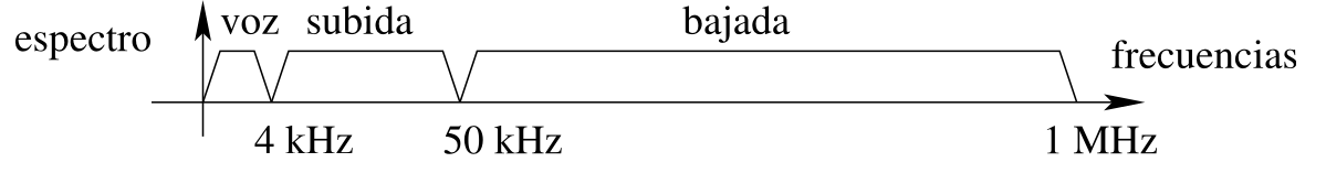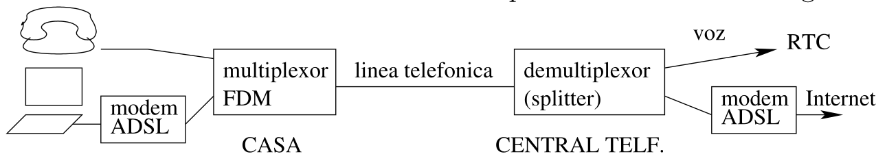 Sección titulada «1.6.2 ADSL»Línea digital asimétrica del suscriptor. Trata de aprovechar todo el ancho de banda en frecuencias del cable que conecta nuestra casa con la central telefónica. Hay que tener en cuenta que en las llamadas la capacidad de este cable es desaprovechada (solo usamos los primeros 4KHz del ancho de banda aprox de 1MHz):