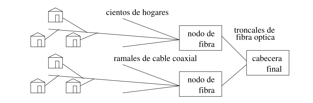 La cabecera final es equivalente a la central telefónica, está centraliza todas las transmisiones de abonados que desde aquí pasan a Internet a través de un router. De aquí los troncales de fibra conectan a los nodos de fibra que a su vez mediante cable coaxial para dar servicios de TV, Teléfono e Internet. Las troncales se hacen a partir de fibra porque necesitan mucha capacidad, el resto de línea coaxial (barato y fácil de instalar). Todos los cables son multiplexados (TDM y FDM).
