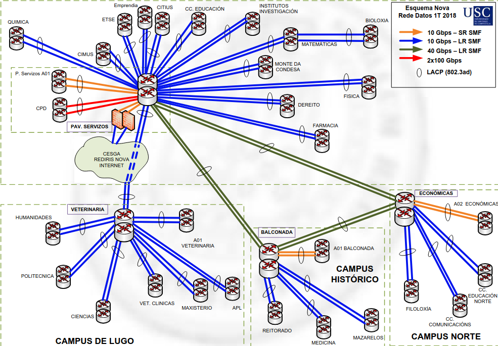 Sección titulada «Red de la USC»- Tres nodos troncales en Santiago y uno en Lugo unidos a través de RedIRIS Nova y el CESGA: -Nodos troncales de Santiago unidos con enlaces dobles de 40 GE -Enlaces dobles desde los nodos troncales a los nodos de distribución de 10 GE -Enlaces a 10 GE entre los nodos de distribución y los nodos de acceso (conmutadores a 100 Mbps o 1 Gbps)