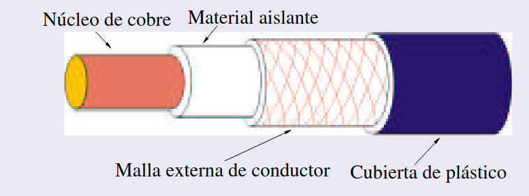 Sección titulada «1.7.2 Cable Coaxial»El cable coaxial esta formador por dos conductores: uno central sólido y otro exterior formador por una malla de hilos finos que recubre al primero. Entre ambos hay plástico, la ventaja de esta disposición es que la radiación queda atrapada entre ambos y no escapa al espacio, evitando pérdidas.