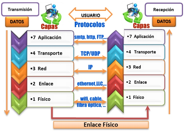 - Protocolos de aplicación: necesarios para que funcionen ciertas apps. Como HTTP (web), SMTP (correo), etc.