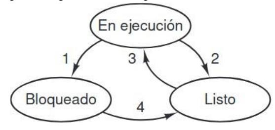 Cuando un proceso se bloquea, lo hace debido a que por lógica no puede continuar, comúnmente porque está esperando una entrada que todavía no está disponible. También es posible que un proceso, que esté listo en concepto y pueda ejecutarse, se detenga debido a que el sistema operativo ha decidido asignar la CPU a otro proceso por cierto tiempo.