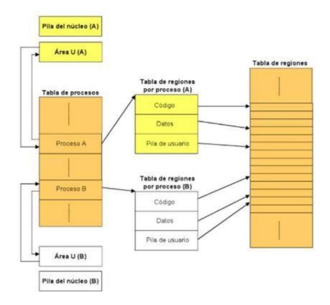 - Tabla de regiones: almacena una entrada para cada región (código, datos y pila de usuario) asignada a algún proceso