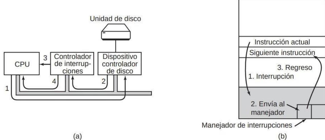 FIGURA 2.11. (a) Los pasos para iniciar un dispositivo de E/S y obtener una interrupción. (b) El procesamiento de interrupciones involucra tomar la interrupción, ejecutar el manejador de interrupciones y regresar al programa de usuario.