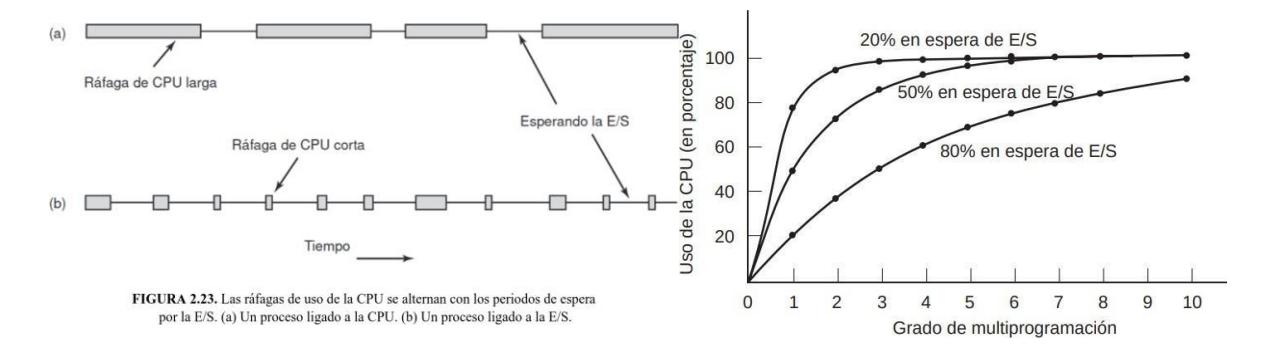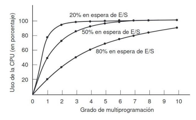 La figura deja claro que, si los procesos gastan 80% de su tiempo esperando las operaciones de E/S, por lo menos debe haber 10 procesos en memoria a la vez para que el desperdicio de la CPU esté por debajo de 10%. Si el proceso promedio realiza cálculos sólo 20% del tiempo que está en la memoria, con cinco procesos en memoria a la vez la CPU deberá estar ocupada todo el tiempo.