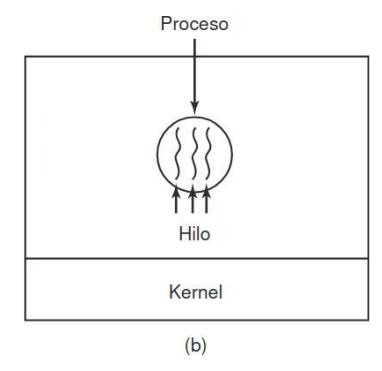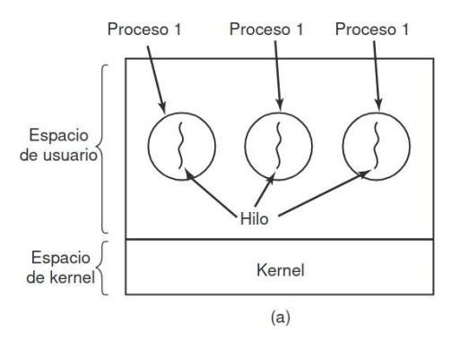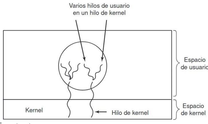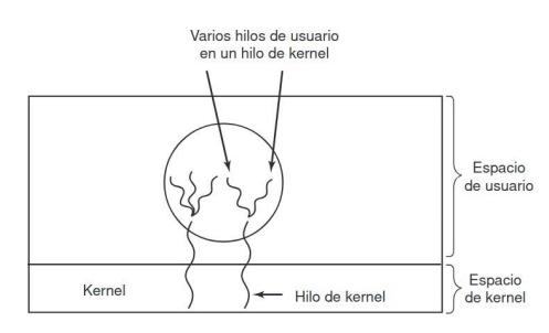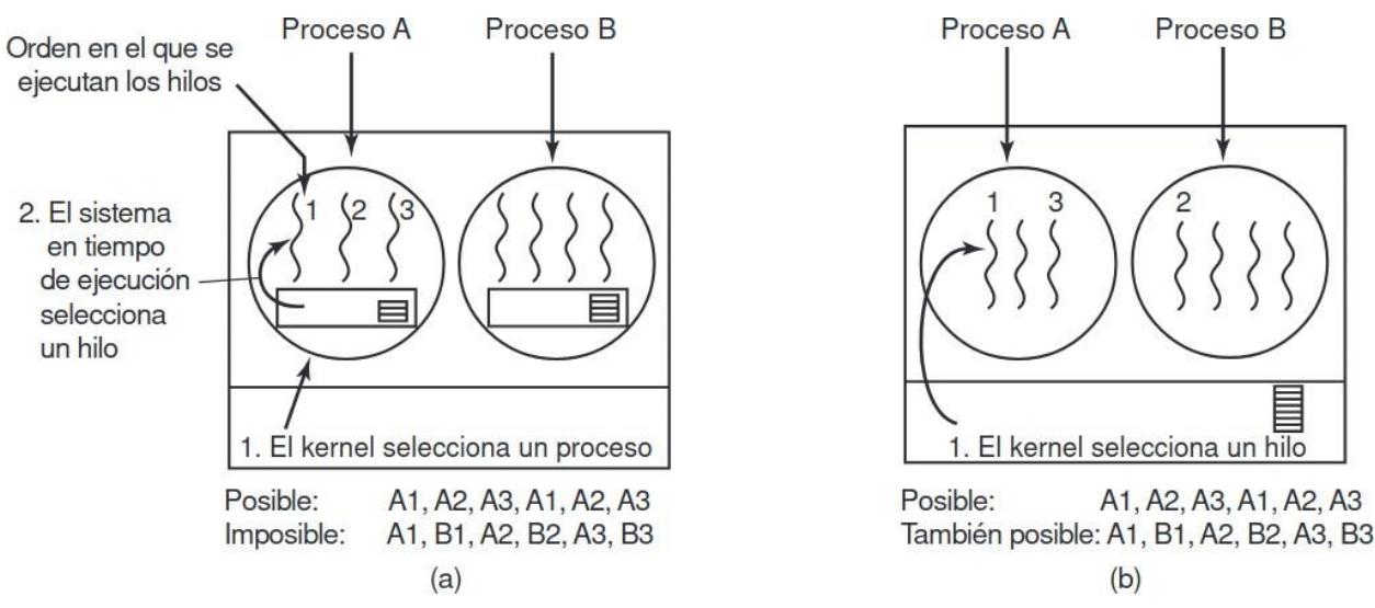 Sección titulada «2.7. Planificación de hilos»Cuando varios procesos tienen múltiples hilos cada uno, tenemos dos niveles de paralelismo presentes: procesos e hilos. La planificación en tales sistemas difiere en forma considerable, dependiendo de si hay soporte para hilos a nivel usuario o para hilos a nivel kernel (o ambos).