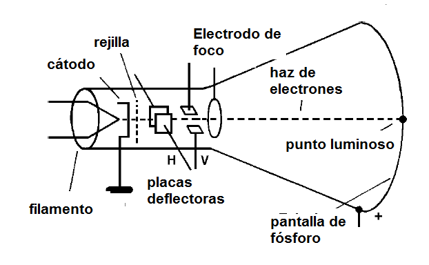 Sección titulada «1.2 Hardware Gŕafico (TRC)»El tubo de rayos catódicos (TRC) consiste en un haz de (haz catódico) emitido por un cañón de q pasa a través de sistemas de enfoque y reflexión que lo redirigen hacia posiciones específicas de una pantalla revestida de fósforo. El fósforo emite luz en la posición alcanzada por los .