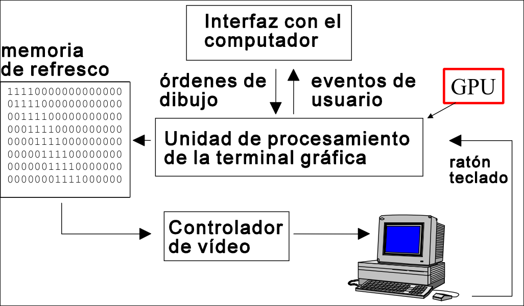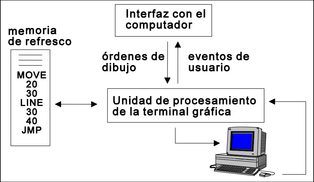 - Unidad de Procesamiento de la Terminal Gŕafica: procesa las órdenes de dibujo y las traduce en comandos para la pantalla. Accede y actualiza la memoria de refresco para mantener la imagen visible