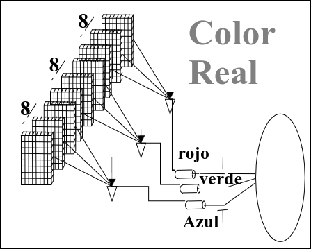 - Para obtener el color real se necesitan 8 bits para cada color (RGB) y otros 8 (A)de transparencia, en total 32 (RGBA).
