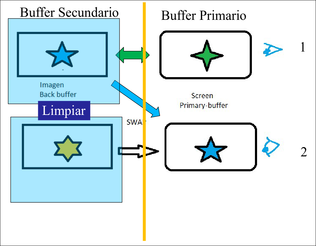 - Una vez lista la imagen, se realiza un swap, mostrando instantáneamente el nuevo frame en el buffer primario.