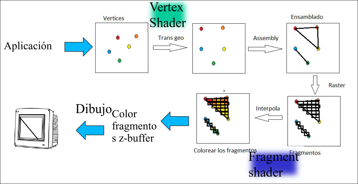- Recibe la posición del vértice del triángulo + otros datos (coordenadas de textura, normal, color, etc.)