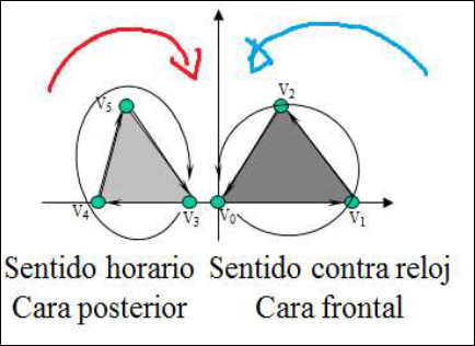 En OpenGl se usa FACE CULLING, es decir sólo se visualizan las superficies cuya normal se dirige hacia la cámara. Por tanto hay que tener en cuenta el orden de creación de los vértices.