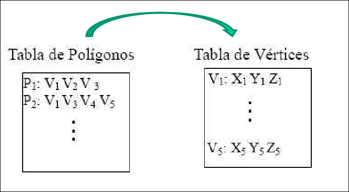 - Indexada: hay una tabla para los vértices (con 3 coordenadas para cada uno) y otro para los polígonos (con los vértices que definen cada uno). Si un vértice se usa varias veces, se escribe una única vez en la tabla de vértices y se puede referenciarse varias veces en la de polígonos.
